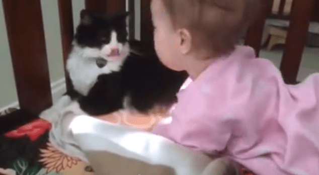 Hoover and Hazel (we’re assuming Hoover is the cat), were left to their own devices in a crib. While Hazel was content to nap, Hoover felt their time together was best spent cleaning up.