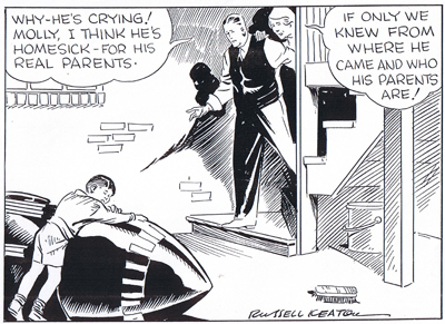Jerry Siegel teams with artist Russell Keaton and they revise and redraw the comic strip. In this version, Clark Kent is born in the future and is the son of the last man alive on Earth, a scientist who sends the boy back in time where he is adopted by “Sam and Molly Kent.” This version is also rejected and Keaton decides “not to gamble on such a young and inexperienced writer” as Siegel and they part ways. Keaton goes on to create the comic strip Flyin’ Jenny and Siegel teams up again with Shuster.
