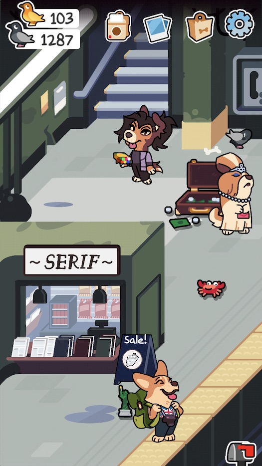 As for the types of dogs you can attract, those range from European backpacking tourist dogs (like you see above) and even–wait for it–a BDSM dog. And, of course, there’s a little visitor’s record showing you who’s visited. But just like Neko Atsume, you have to snap a photo of them hanging around in order to know what they look like, otherwise you’ll just get a silhouette. And of course, like Neko Atsume‘s gold and silver fish “currency,” the primary currency of Central Bark is pigeons, which are left behind when dogs visit.