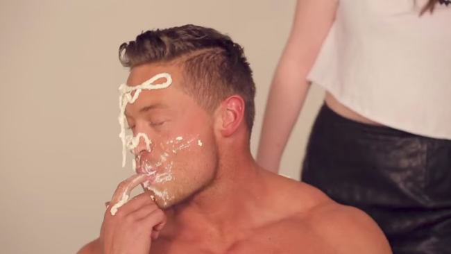 Sure, the music video shows off a shirtless Cameron Dallas wielding a chainsaw in all his macho glory, but it also shows men performing what are usually seen as feminine activities and behaviors, such as having pillow fights, peering seductively into the camera, taking care of babies, washing dishes, and erotically eating food. This behavior is also not portrayed as comedic or humiliating, but as genuinely sexy. The viewer is never meant to be laughing at them. The men in the music video aren’t performing excessive masculinity or exaggerated non-masculine behavior that’s intended to look ridiculous and that’s okay. “Boys” affords us a look at men without testosterone goggles on. “Boys” catches the men in moments of genuineness, vulnerability and carefreeness.