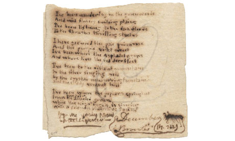 Signed C Brontë, and dated by her on 14 December 1829, “I’ve been wandering in the greenwoods” is written on a piece of paper measuring just three inches square, and is difficult to read without a magnifying glass. Charlotte and her siblings all wrote in a tiny hand, to make the most of a scarce and expensive paper supply, but they were also short-sighted, so would have been able to see what they were writing themselves, even it was illegible to others.