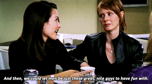 Charlotte was open to the idea of a threesome and even flashed her breast in public once. She’s not non-monogamous, but she is not a prude. I don’t know about you, but even my breakfast talk doesn’t include discussing how bad another dude’s sperm tasted. Samantha and Charlotte are both extra for comedic effect and easy binaries, but it is not a reflection of their morality at its core.