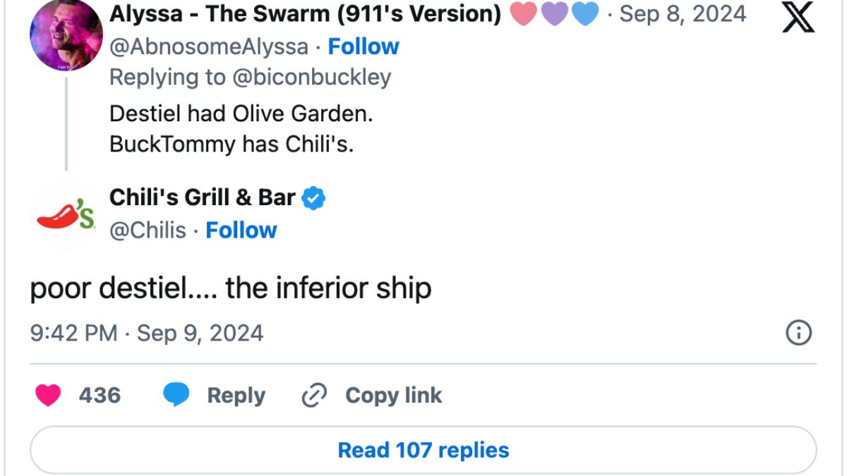 The official account of Chili’s Grill & Bar on X was mingling around on the social media platform, making friendly conversation, as brands do, with a couple of stan accounts of ABC’s 911 characters Evan Buckley and Tommy Kinard, ship-named BuckTommy.