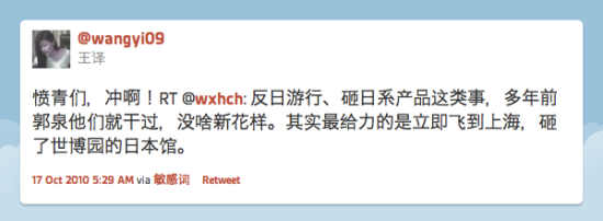 Angry youth, charge! RT @wxhch: Events like the Anti-Japan demonstration and smashing of Japanese goods — Guo Quan and his cohorts have already done this before, it’s nothing new. Actually, if you wanted to kick it up a notch, you’d fly straight to the Shanghai World Expo and destroy the Japanese Pavilion.