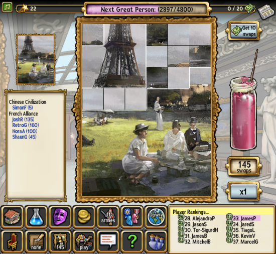 The culture minigame is a simple tile swap, that thankfully is more of a click-and-match. Multiple people play it at once, so you want to be crafty and try to nail the completing swap for a nice finishing bonus: