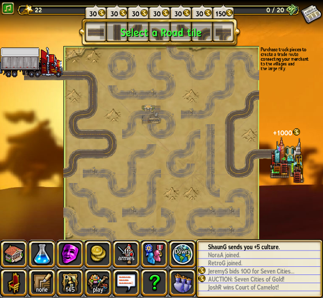 This is the gold minigame. Connect roads through the different villages and connect them to the final destination to score the available gold prize. Each road costs money that detracts from the final prize, so you want to be efficient. The max prize, which so far seems to be 1,000 gold, stops mattering pretty quickly, as your city will generate much larger amounts of gold throughout the day.