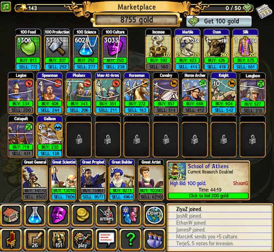 After finally building enough population, hammers, and eventually the other resources, you can mercifully click on all the little buttons in the HUD without fear of severely hampering your city’s early game growth. You can play with the market, which seems to be the only thing gold is used for, and do the MMO-style auction house babysitting — constantly watching the changing market and buying resources, military units, and Great People low and selling high. The market seems to change frequently, so if one literally doesn’t do anything else throughout their day other than watch the market, one can probably become rich rather quickly (in terms of Civ World speed, at least) and in turn, buy resources to grow their city faster.