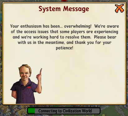 Even though the game has hit an open Beta, you still might not be able to actually access the game. Yes, it is a Beta, which means the very essence of the release is purely for the dev team to knock out all the issues, but you know what usually doesn’t happen in an open Beta? Being prevented from actually playing the game. Sure, a Beta sometimes has a few connection issues here and there, but by and large, the Beta release is to knock out the “leftover” issues, rather than one so big as literally not being able to play. But, for the sake of Beta, we’ll let the connectivity issues slide, and hey, the team is fully aware of the current connectivity issues, and they even apologize with an adorable cartoon Sid Meier, which, with me lumping Meier into the small group of “GAMING GENIUSES,” (you too, Tim Schafer, Fumito Ueda, and everyone at Harmonix) all caps, well, it melts my cold, jaded gamer heart.