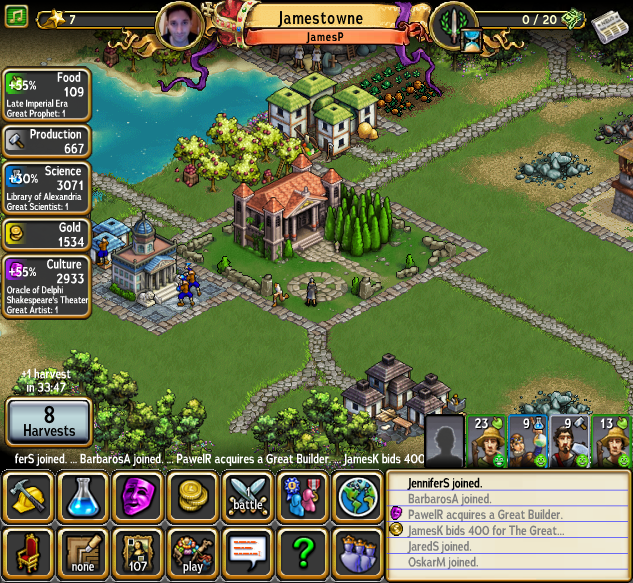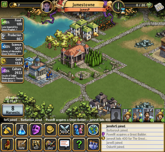So far, most of the time this screen fails to load, and thus doesn’t show my current games and available games to join. Again, the conspiracist in me thinks the dev team really doesn’t want me to play. But I am clever, and figured out that even if the login screen doesn’t allow me to join my matches, I can click the red arrow icon toward the top of the screen, which takes me to my city, successfully bypassing the never-loading login screen and granting me access to the game. I’m not sure what would happen if I had multiple in-progress games and clicked on that button, because a second available game didn’t open up for me until last night (the only other time the login screen actually loaded aside from the above screenshot over the course of the past week). I’m sure there was some milestone I hit which unlocked the second available game, but I’ve no idea what it was. I received a message saying it was now available and that was that. If you manage to cleverly work around the failed login (or have it load properly, I guess) and get into your city view, then manage to withstand the amount of time it actually takes for your city and HUD to fully load, you are now looking at Civilization’s take on FarmVille.