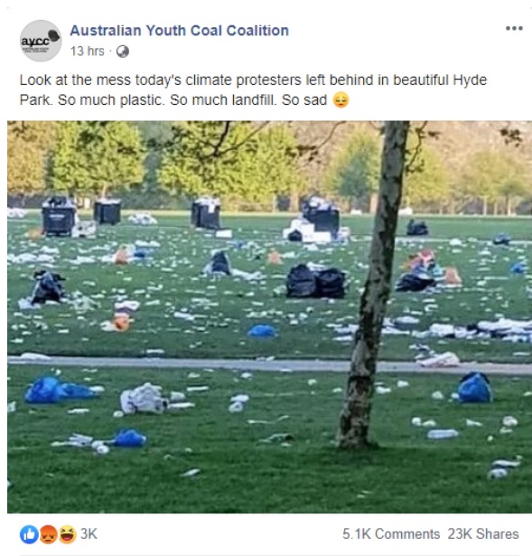 “Look at the mess today’s climate protesters left behind in beautiful Hyde Park. So much plastic. So much landfill,” read post’s caption.