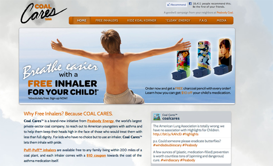 Peabody Energy, the world’s largest coal energy company, has been the target of an ingenious prank called “Coal Cares.” The site claims it is giving away free “cool” inhalers featuring the likenesses of Justin Bieber, My Little Pony, and others for kids who live within 200 miles of a coal-fire power plant. It also offers “fun” games and activities, likely chosen to help kids remain inside and asthma free.