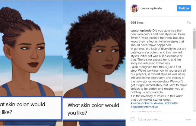 None of the 94 responses to this statement have been replied to by the Episode staff as of yet. (3/19/17) (http://forums.episodeinteractive.com/forum/main-category/announcements/1235333-episode-s-commitment-to-diversity)