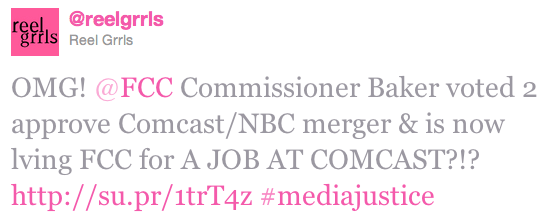 The merger was approved by one Meredith Baker, who used to sit on the Federal Communications Commission board. In a move that looks like a blatant conflict of interest, Baker has been hired by Comcast as its senior vice president of government affairs. In other words, a lobbyist. Hmm. Yeah, just a hint of line-blurring between the public and private sectors. So naturally, Reel Grrls, which receives corporate funding from Comcast, expressed a bit of concern that Comcast would hire Baker for such a role: