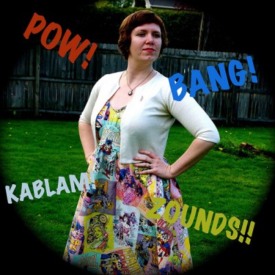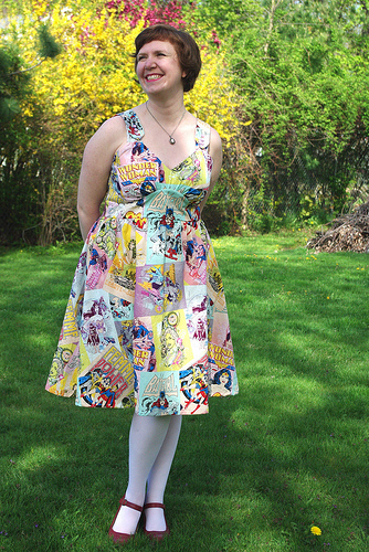 Last week we brought you a collection of superhero fashion. They included some Avengers-inspired sketches, a comic strip dress, and some high-fashion Kirby-like designs but one of our readers created her own dress that’s almost like a combination of the three. Read on for some details on her creation she put together especially for Free Comic Book Day, including where she found that fabulous print!