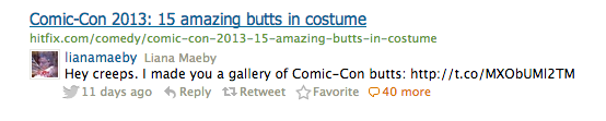 After my initial tweet was retweeted over fifty times with no response from HitFix, I wrote two more tweets; one to the author of the post Liana Maeby and another at HitFix Executive Editor Daniel Fienberg. Maeby’s own tweet publicizing the post on her account read, “Hey, creeps. I made you a gallery of Comic-Con butts.” It has since been deleted but here is a screenshot I took from the website Topsy, which keeps tweets even after deletion for some time.