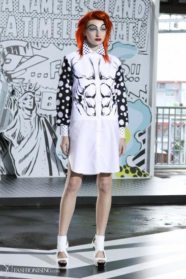 And now for some runway fashion inspired by Jack Kirby, you know, the artist responsible for creating Captain America, Iron Man, the Hulk, and more? Fashionising has a slew of pictures from a runway show by designer duo Luke Sales and Anna Plunkett in a partnership with Marvel. Here are a few highlights.