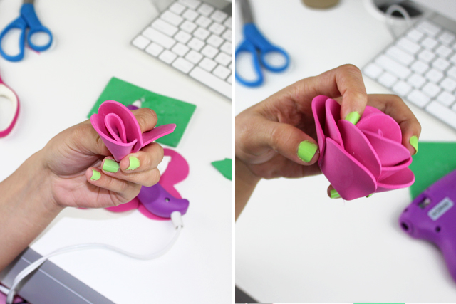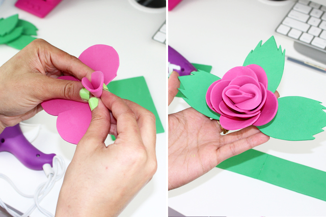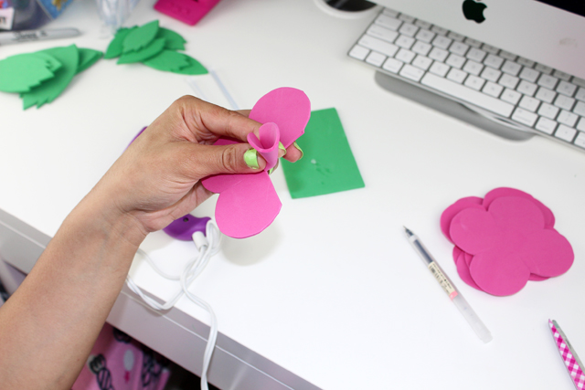 Using three petals, fold each petal until a flower is formed. Glue on three big leave on the back and ta-da!