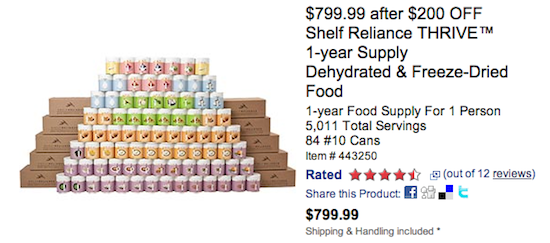 Extremely cheap people and post-apocalyptic crusaders against zombies have a common friend in Costco: On their website, the wholesaler is selling Thrive, which consists of a year’s supply of dehydrated and freeze-dried food, all served up in gallon-sized cans. The price tag: $800. (If you buy it after October 10th, it jumps up to $1000.) That’s 5,011 servings of food, most of which have a shelf life of up to 25 years. Here’s what you get: