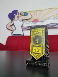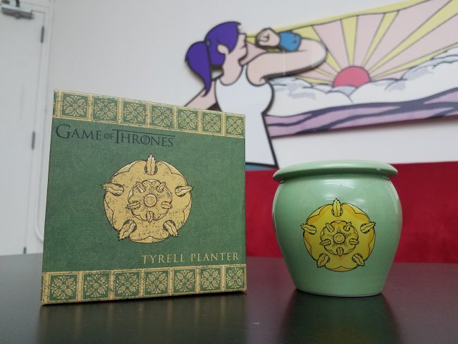 There’s no more appropriately house-themed item in CultureFly’s Game of Thrones box than this lovely planter, fit for Highgarden. Crafted in Tyrell colors, with a prominent Tyrell golden rose, this homage to the House’s motto of “Growing Strong” will take center stage on your windowsill.