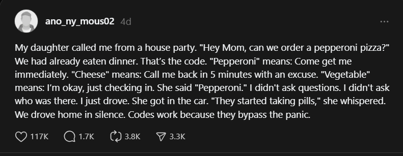 The post inspired many parents, some with kids as young as seven or nine, to set up similar codes with their own children. Some even added humorous but serious twists. One family joked about adding “stuffed crust” as a signal that things were escalating quickly and authorities might be needed.