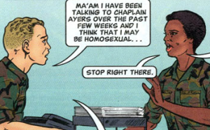 The comic book idea makes sense in theory. DADT is an incredibly complicated policy in practice so, instead of sitting all of the nation’s soldiers down for a lecture, the military gives them a comic. A comic about…a bunch of our nation’s soldiers sitting down for a lecture. Ugh. This may be the most boring comic book ever written.