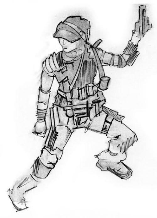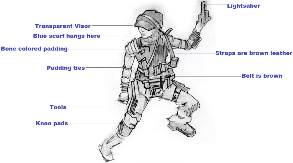 I had trouble with the loose free-flowing scarf, so I didn’t depict it. She has a ton of detail and gadgets on the costume, so please forgive me for any ambiguities. The pants reminded me of Boba Fett’s pants (they’re not). The knee pads, chest and scarf are a dark blue. The pants are grey. Her arms are a white “bone” looking padding, tied off with brown straps. My sketch looks like she has a hat brim but that is supposed to be a transparent visor.