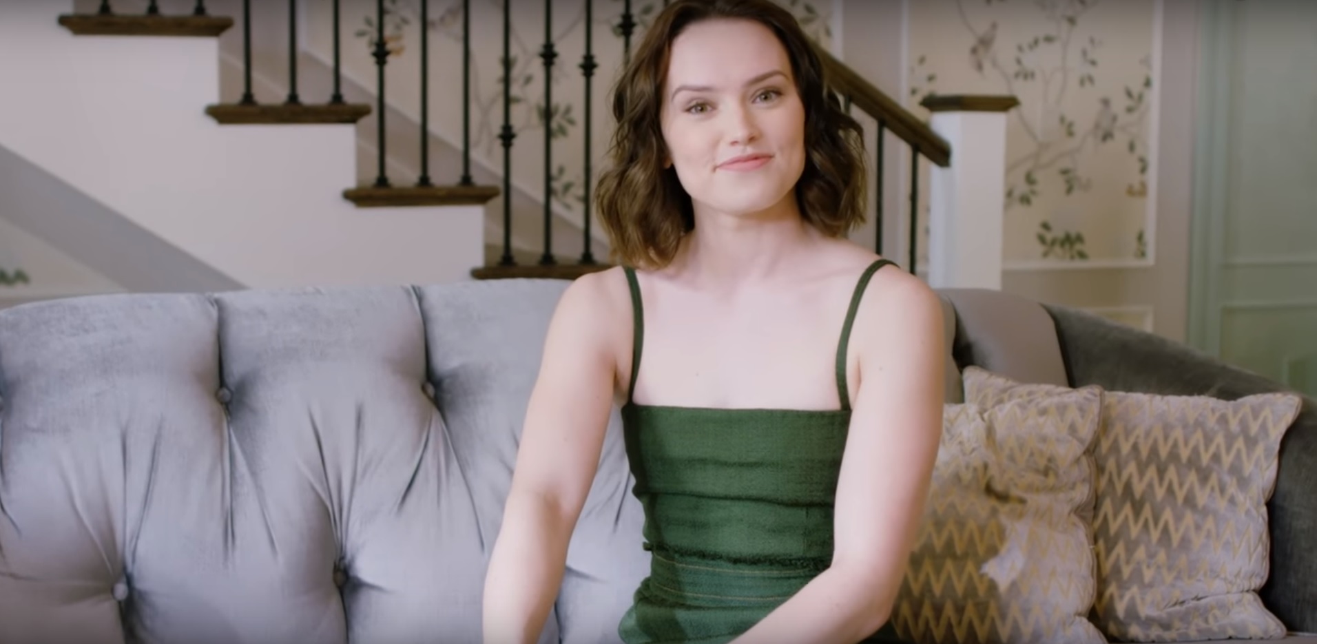 Out on the terrace, Ridley full-on embraces her Britishness with a service of tea and cakes before the interviewer asks her about Star Wars. Ridley shows off her light saber skills, then totally agrees to tell him everything about The Last Jedi … but not before pulling out an extensive NDA and making him sign it. She then proceeds to spill all the beans, but of course it’s all bleeped out so we can’t hear it.