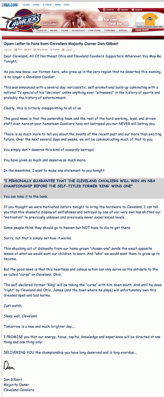 Dan Gilbert was so upset, in fact, that he wrote a very angry open letter to Cleveland fans, laden with surprising capitalizations and lines like “The self-declared former “King” will be taking the “curse” with him down south. And until he does “right” by Cleveland and Ohio, James (and the town where he plays) will unfortunately own this dreaded spell and bad karma,” and “‘I PERSONALLY GUARANTEE THAT THE CLEVELAND CAVALIERS WILL WIN AN NBA CHAMPIONSHIP BEFORE THE SELF-TITLED FORMER ‘KING’ WINS ONE’ You can take it to the bank.”