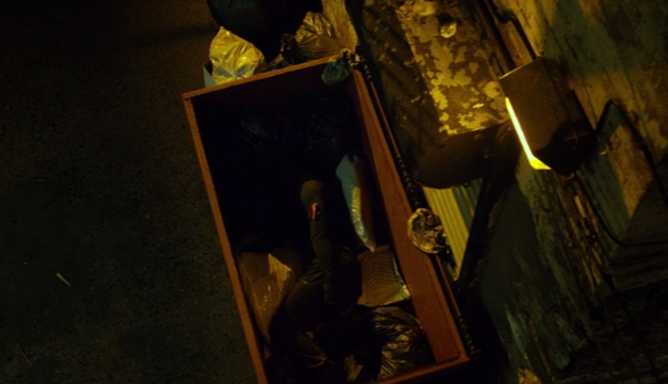 Oh, that “Bam”? I guess we’ll say that was Daredevil landing in a dumpster after getting his ass handed to him by the guys who kidnapped the kid, because that’s where we find him at the beginning of episode 2, “Cut Man.”