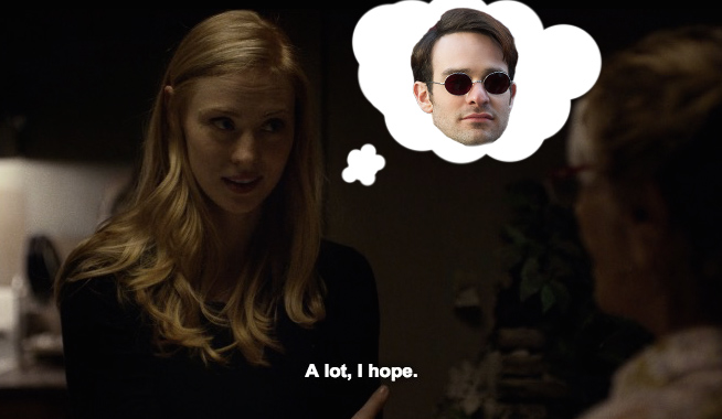 Karen tries to get Matt to weigh in on the subject/seriously just admit it’s him already, and things get a bit awkward—before they get a lot awkward when Foggy tries to ask Karen out again and gets blown off. Then Foggy asks Matt about his secret lady friend (Claire), and Matt says it didn’t work out, and OH GOD WHY I THOUGHT WE’D FIXED THIS. DAMMIT, MURDOCK.