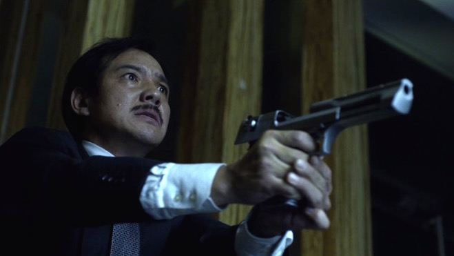 BUT then someone appears who brought a—albeit large—knife to a gunfight because like other characters I could name, he apparently dgaf. Which turns out to be warranted as he slices Paul’s gun-holding hand off and demands information about “Black Sky.” Bunyan tells him it’s on a ship on the way to New York, and then sword dude cuts his head off or something equally gruesome and gets back in the elevator just to make sure he’s completely ruined Paul’s day.