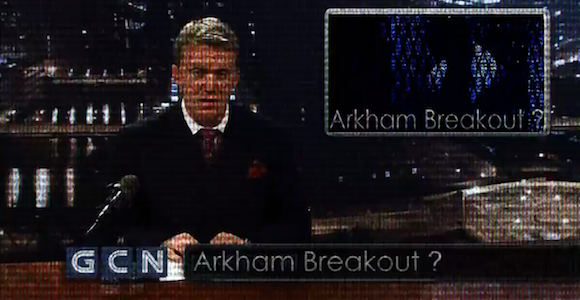 One shows Anthony Michael Hall, reprising his role as Gotham newscaster from The Dark Knight, commentating over some grainy footage of an Arkham breakout.