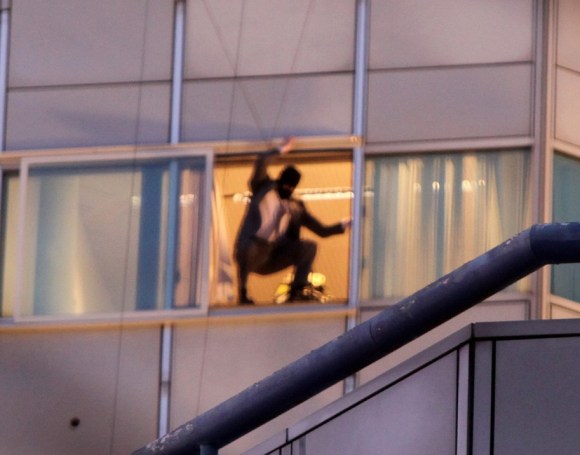 A new set photo from Christopher Nolan‘s The Dark Knight Rises is out! And it’s a dude! In a suit! And a ski mask! … Jumping out of an office window! .. And that’s all we really know. That’s a bit underwhelming, struggling to even be as interesting the magical vague green pit that came off their location shoot in India. Slightly. But hey! Now we know there are people doing actiony things in this movie! And that’s enough to satiate us until we see some of the actual actors doing actory Bat-things. Click through to see the full version of this picture.