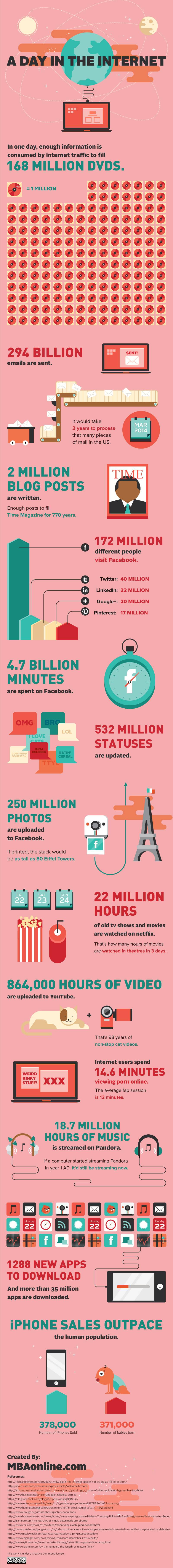 The Internet is a big place. There are a lot of tubes, so to speak. The amount of data that is created, shared, and consumed on the internet is practically impossible to conceive of in a physical format and would be literally impossible to deal with that way. That said, how much data really is thrown around? That’s what this infographic from MBA Online attempts to tackle, and the results are staggering. 98 years of video? 770 magazines worth of blog posts? Each and every day? Now it’s up to you to decide whether this is a triumph of the digital age or an embarrassingly large amount of digital trash, but one thing is for sure: It’s a lot and I’m glad we don’t have to try and cram it all on a shelf somewhere.