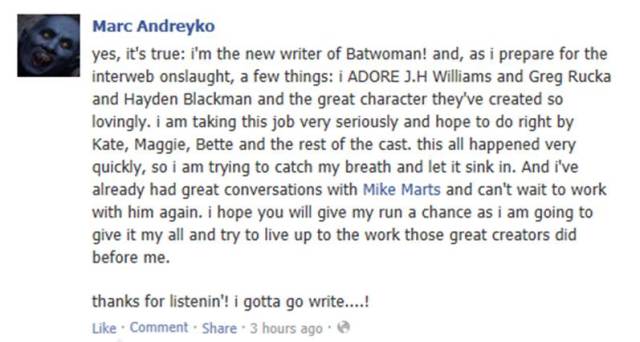 DiDio then announced openly-gay writer Marc Andreyko (best known for his run on Manhunter) as the new head writer on Batwoman. Andreyko released the following statement on his Facebook page:
