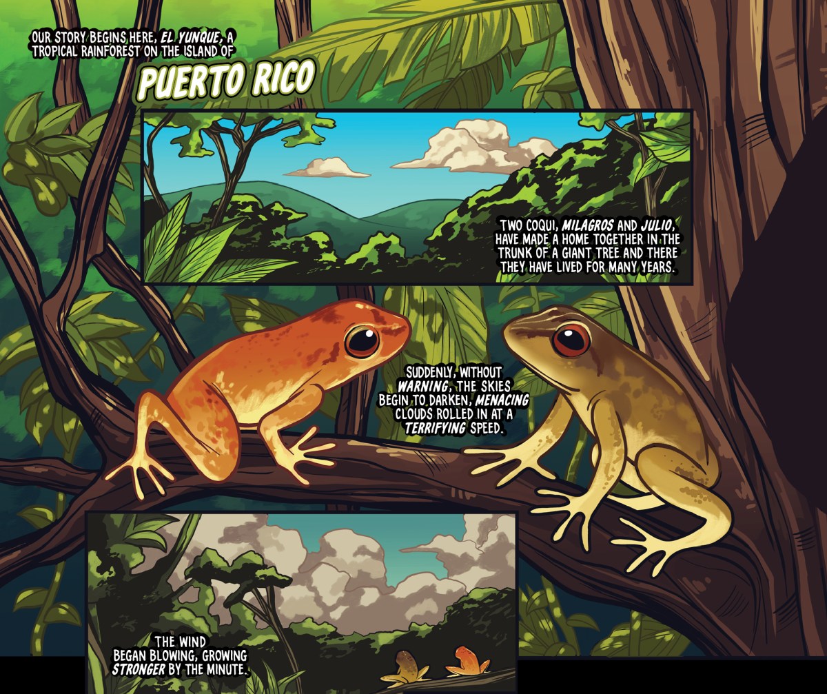 Thanks to Somos Arte and Miranda-Rodriguez, we have two preview pages from the anthology. The first is a page from a story called “Coqui,” written by Javier Muñoz and drawn by La Borinqueña‘s Sabrina Cintron: