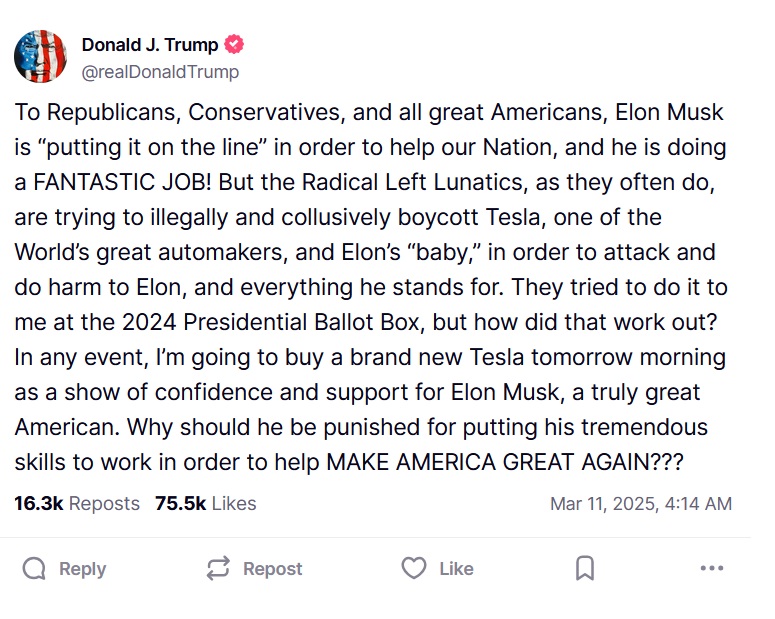 “The Radical Left Lunatics, as they often do, are trying to illegally and collusively boycott Tesla, one of the World’s great automakers, and Elon’s “baby,” in order to attack and do harm to Elon, and everything he stands for. They tried to do it to me at the 2024 Presidential Ballot Box, but how did that work out? In any event, I’m going to buy a brand new Tesla tomorrow morning as a show of confidence and support for Elon Musk, a truly great American.”