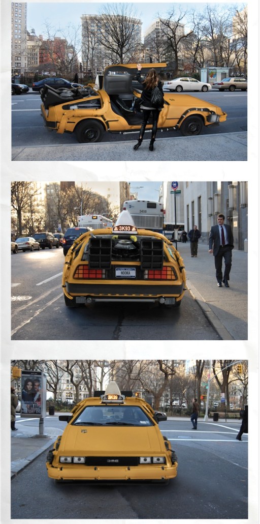 It’s true that New York taxis usually drive like maniacs but it’s pretty difficult to get up to 88 mph in Manhattan. Unless you’ve got a hover conversion, of course. Unfortunately, this isn’t real. Mike Lubrano imagined what a Back to the Future taxi would look like for a NYC fashion house called Nooka. Hit the jump to see it with the doors open.