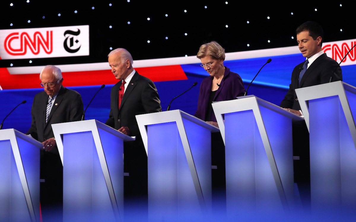 Bernie Sanders, Joe Biden, Elizabeth Warren, and Pete Buttigieg stand at their podiums on the stage of the fourth Democratic debate.