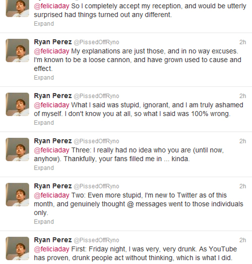 One thing we’re still confused by, idiocy not withstanding, is why it was Felicia Day in particular who served as the target of Perez’s drunken tirade against…whatever. As part of Perez’s 7-part apology, issued directly to Day on Twitter Saturday night, he stated, “I really had no idea who you are,” and even magnanimously offered, “I plan on actually viewing your portfolio before saying more about…well, you.”
