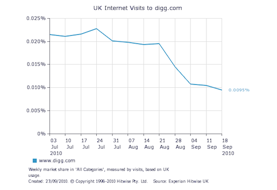 The infamous Digg redesign didn’t really go too well for Digg. It kind of incited an Internet rebellion. One may have suspected that the feelings of antipathy may have passed given time or that they were overblown by a small but vocal minority of dissatisfied power users, but a recent study from Hitwise Intelligence suggests otherwise: Since the Digg redesign went live in August, Digg’s US traffic has dropped 26%, while the UK traffic has dropped 34%. For an established site on the Web, much less one hoping to woo big advertisers, that kind of traffic decline in just one month is nothing short of alarming.