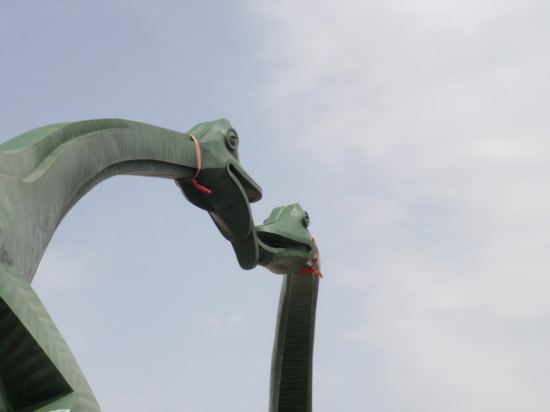 Apparently the two sauropod, rumored to be the largest dinosaur statues in the world, are to celebrate the numerous fossil discoveries made nearby. The aforementioned Dinosaur Fairyland park also attempts to capitalize on the area’s fossilized denizens with statues scattered across the landscape, but has failed to draw huge crowds. All that despite the smooching dinos and an enormous Hollywood-esque sign. Probably because its located in the middle of a desert.