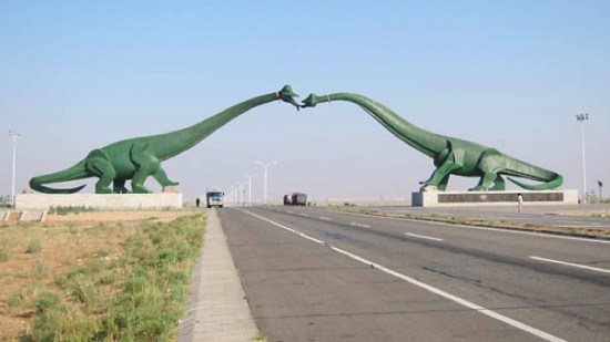If you’re looking for an excuse to visit China, here’s a great one: At the city of Erlian, near the border with Mongolia, there is an enormous statue of two dinosaurs. And they are totally making out. The whole complex was designed to draw attention to the nearby Dinosaur Fairyland park, but that pales in comparison to the site of two long-necked dinos tongue wrestling.