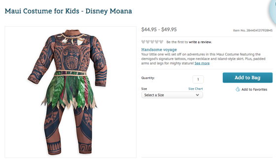 Halloween is not a holiday that evokes cultural sensitivity, but considering the diverse team and the positive attention Moana has been receiving in anticipation for Disney’s first Polynesian princess, the Maui costume that recently appeared on the Disney Store raised some eyebrows. The costume, along with a wig you can purchase separately, allows children to don the demi-god’s brown skin, rope necklace, and skirt. The ocean is calling, and it’s like, “dude, no.”