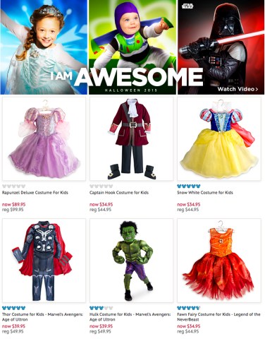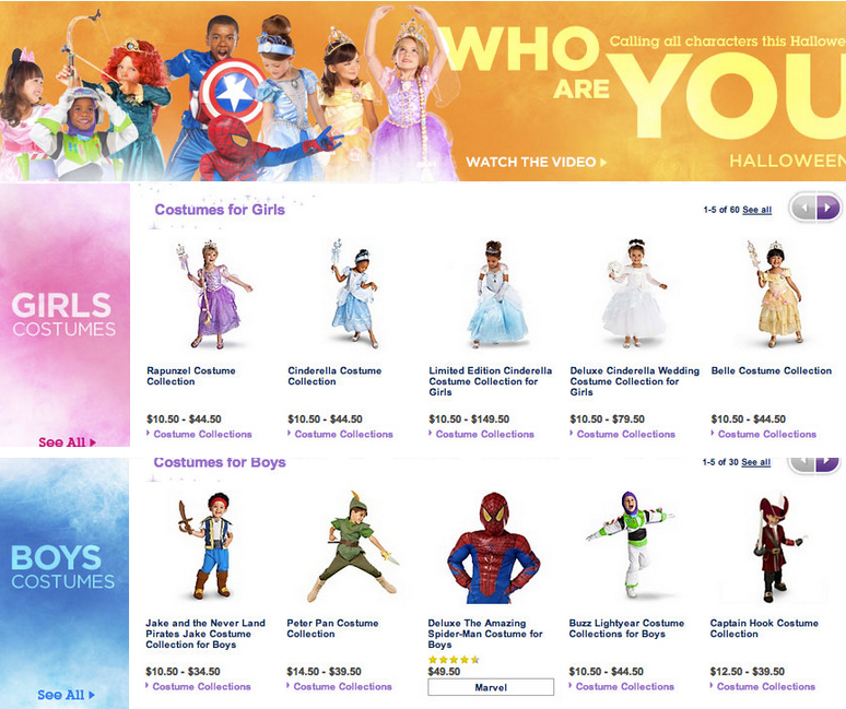 Every year around Halloween, Disney Store has released their collections of costumes for children. They come with themes such as 2013’s “Who Are You?” and 2014’s “I Am.” Only problem is that, for years, they have been separated by gender in highlighted sections labeled “Boys Costumes” in blue and “Girls Costumes” in pink as seen in this 2013 screenshot from their website: