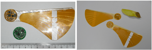 The second prototype is called the Samara, with a design based on the maple seed, which is itself a pretty effective little helicopter. The circuit board on this design is traditional and rigid, attached to an antenna and flexible wing. While the Samara’s flight is less controllable, its floating descent can protect electronics without needing a parachute or separate landing system.