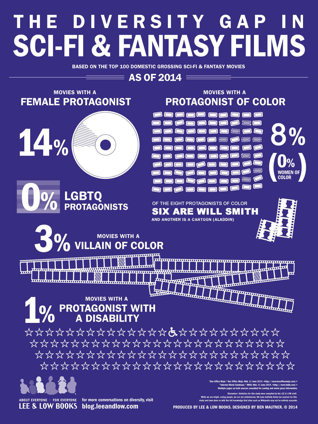 The data was collected in a recent study by children’s books publisher Lee and Low Books, who looked at the 100 top domestic grossing sci-fi and fantasy movies using information from Box Office Mojo. Only 14 of movies featured female protagonists, which is heinous, but even worse is that only 8% had protagonists of color—Will Smith played six of them and Keanu Reeves played the other two. Yeesh. And only one, Avatar, featured a disabled protagonist.