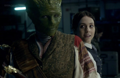 For a refresher, we last saw Madame Vastra in the episode “A Good Man Goes to War.” In that episode, here is what we learned about Vastra: she eats people, she is in an intimate, interspecial relationship with Londoner Jenny, and she knows the Doctor very, very well. Since she owed him a favor, Vastra helped track down the Ponds’ baby, Melody. Despite her healthy appetite for humans — and when I say “appetite,” I mean she literally wants to eat them and not just know them carnally — her loyalty to the Doctor is undisputed and she orders her soldiers to protect Melody at all costs upon finding her. Vastra and Jenny were so popular as characters that the idea for a spin-off was thrown around, but never pursued.