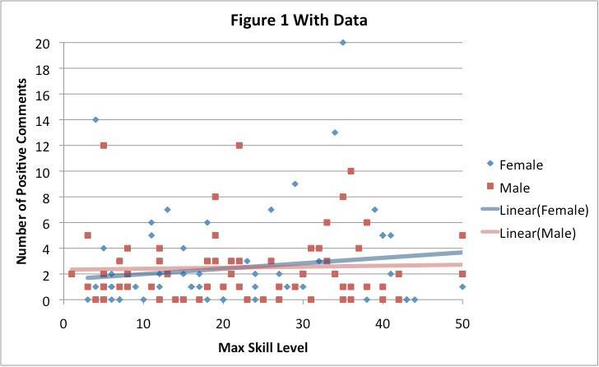 When you see all the data laid out, it becomes a lot less clear that lower level players were less complimentary … This chart shows that the more times a player died, the more they insulted both the male and female experimental player, with the female getting a bit more negativity at first but then the male getting much more at the far end of the “loser” spectrum.