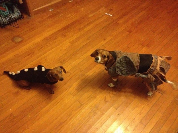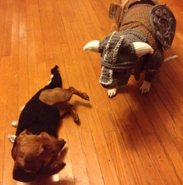 No names are mentioned, but these costumes — that of a dragon and a dragonborn — were made by someone’s sister for the latter’s beagle and dachshund. And here are more pictures: